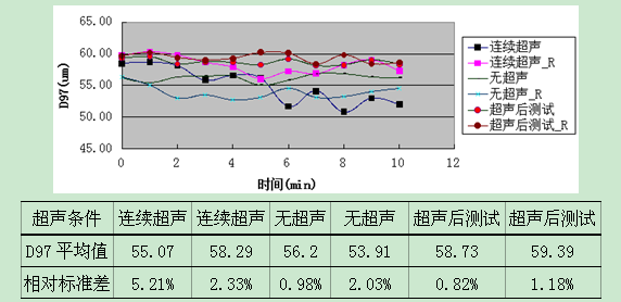 如表4所示,不同超聲條件對結果隨時間測試的穩定性影響還是較大的,我們選取了測試體系較穩定的10ppm六偏條件進行測試,連續超聲或無超聲時,測試結果波動較大,且重復取樣測試結果數值偏差較大。在超聲2min后,關閉超聲進行測試,在所測試的10分鐘時間內結果均保持穩定,重復取樣測試結果也非常接近。與此同時,也發現在連續超聲條件下,D97數值開始5、6分鐘呈下降趨勢,之后波動比較劇烈。不同超聲條件下D50等數值也有與此類似變化。