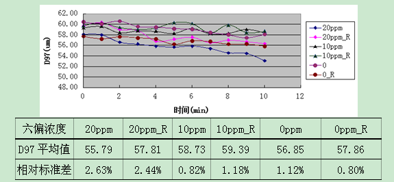 表5:SFC-105B進樣器不同六偏濃度條件對D97隨時間變化的影響