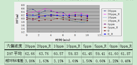 使用LS-POP(9)主機,分別連接SFC-105B自動進樣器測試立磨碳酸鈣樣品的粒度,介質容積約500ml。各次加入的六偏磷酸鈉濃度依次約為20、10、5、0ppm,加樣至遮光比在7~12%之間,直接超聲2min后,連續測試5次,并統計粒度測試結果2um含量、D50、D97隨六偏濃度測試穩定性,即相對標準偏差的變化情況。